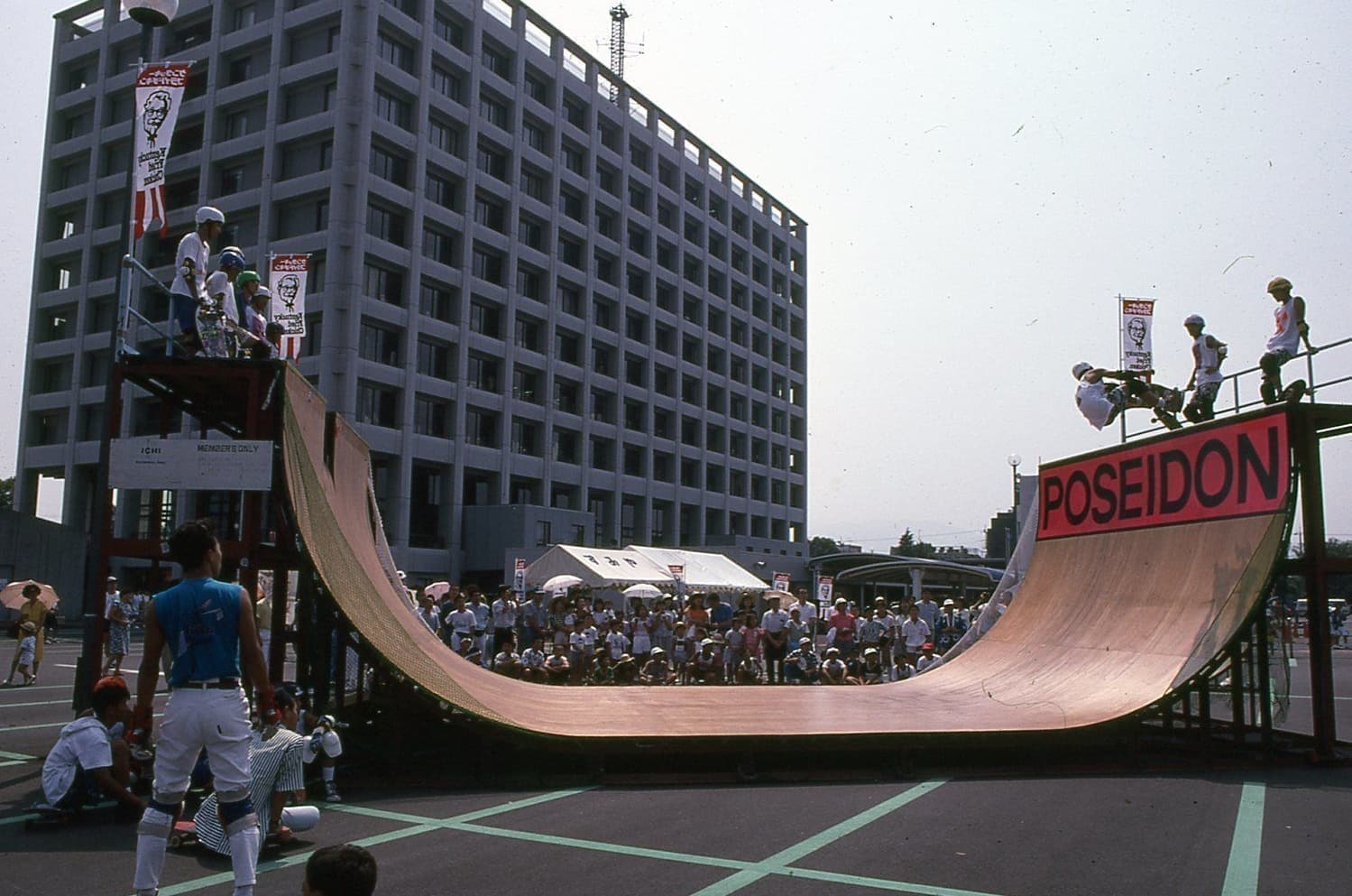 なんとこれは、30数年前の富士市役所駐車場でのPOSEIDON 10Feetランページを仮設してのスケートボードイベントの写真。